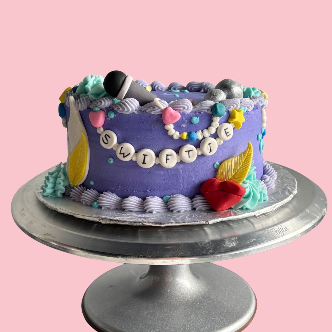 - A finished vanilla American buttercream cake decorated in true Swiftie style, complete with a piped friendship bracelet, colorful buttercream details, and fun Taylor Swift-inspired accents